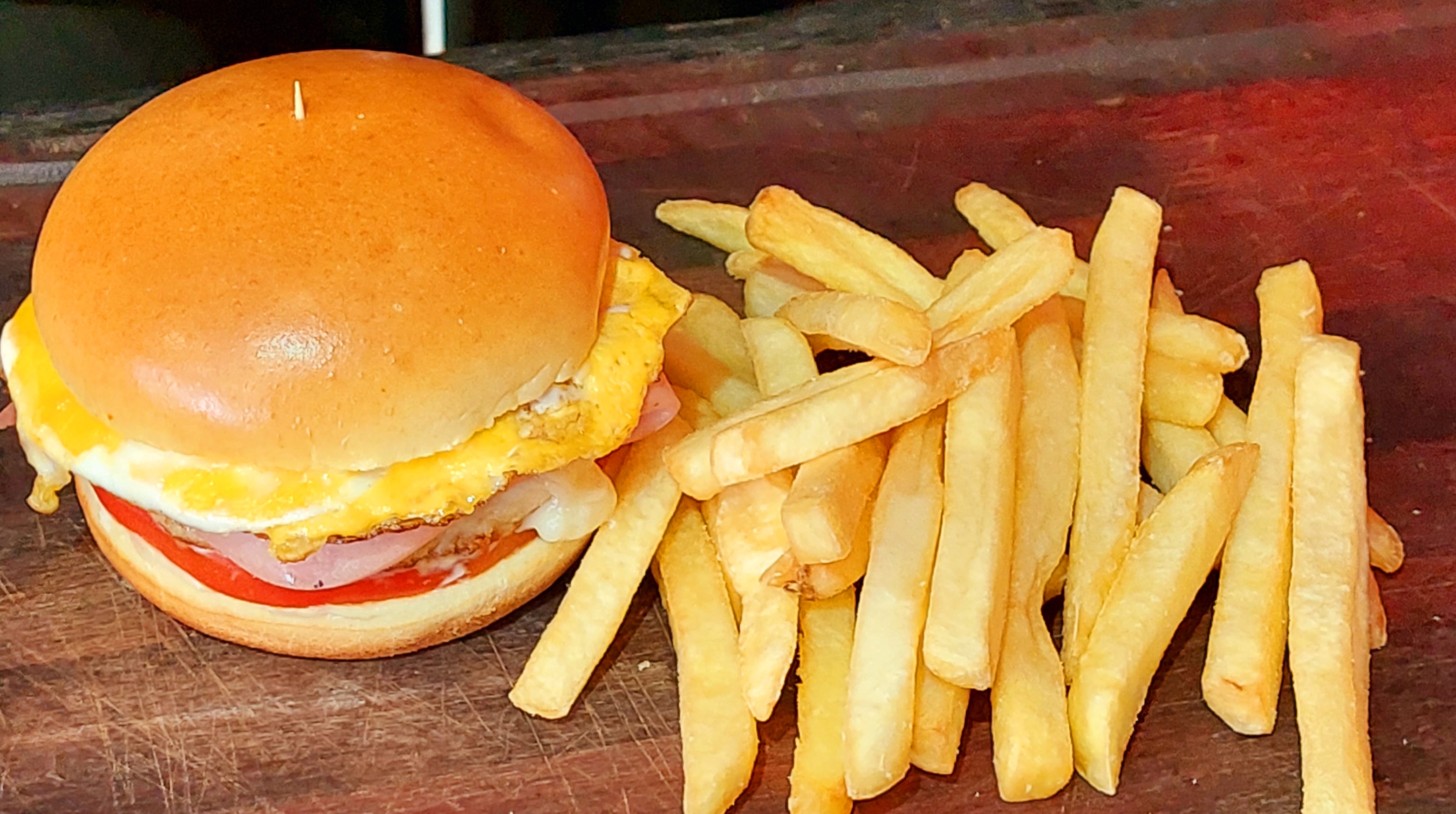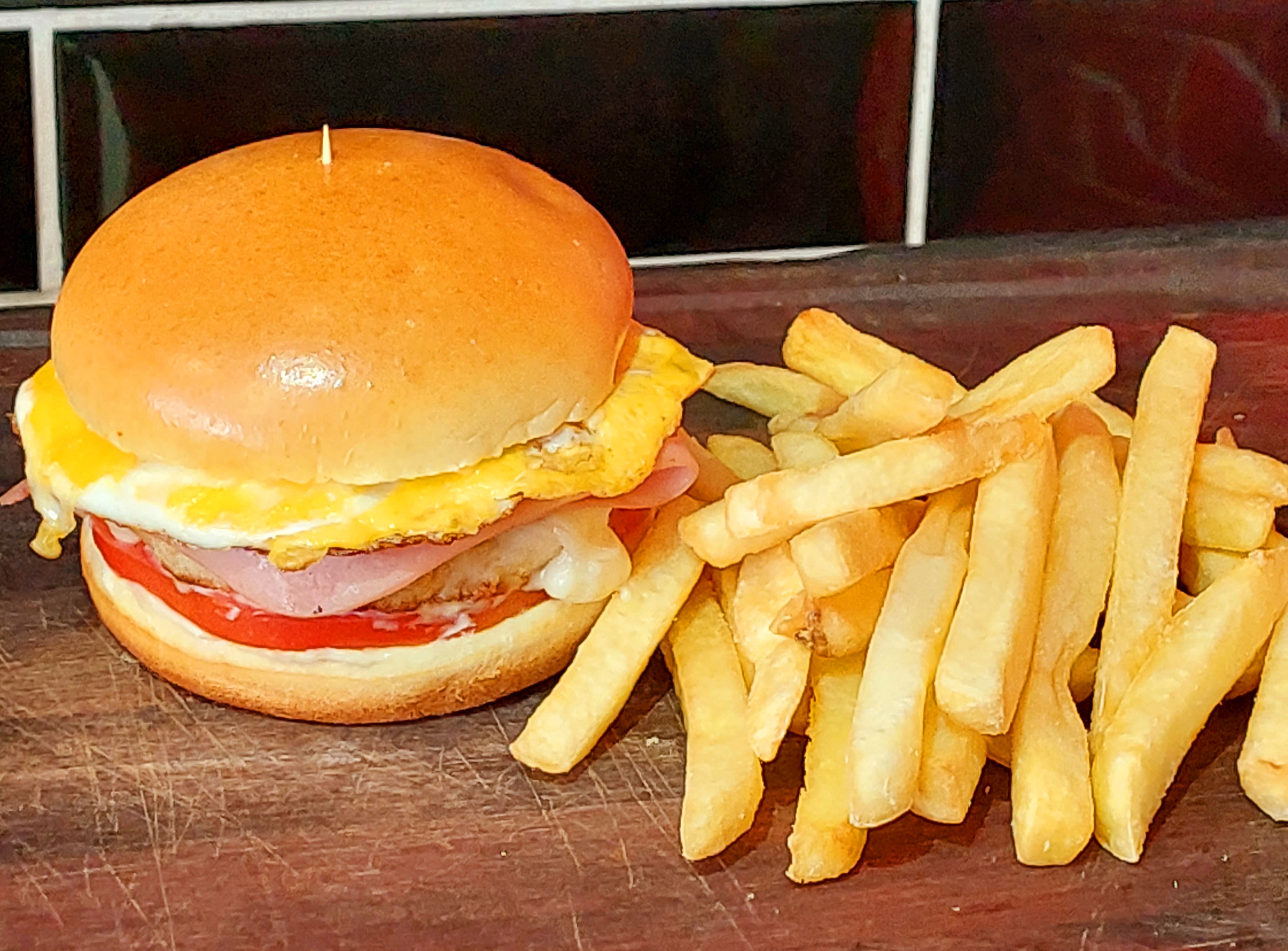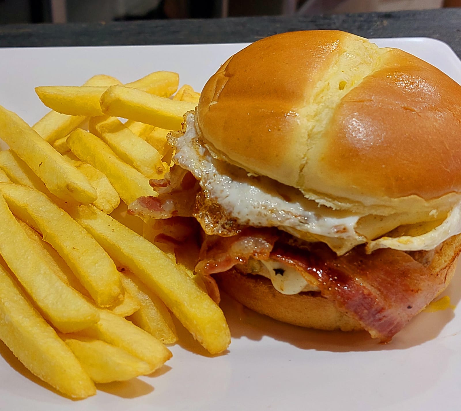 Pan de papa, hamburguesa de pollo, panceta ahumada y queso cremoso, huevo frito y mayonesa especial.