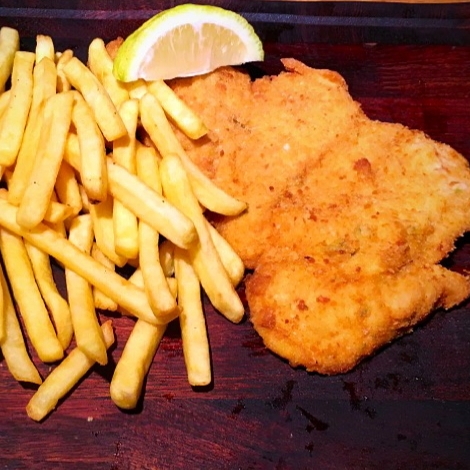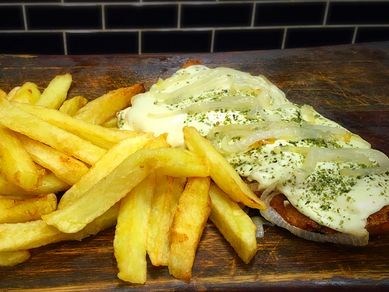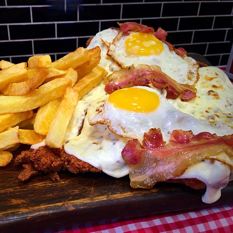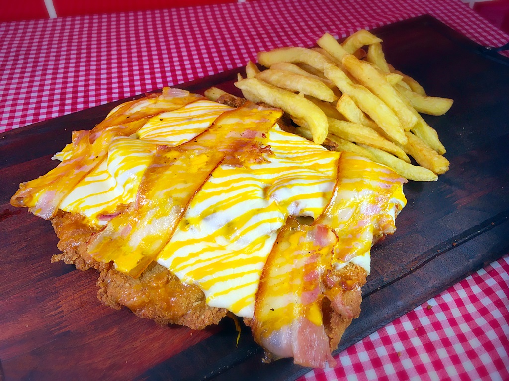 Mila de pollo, queso, panceta ahumada y huevo frito + acompañamiento a elección
