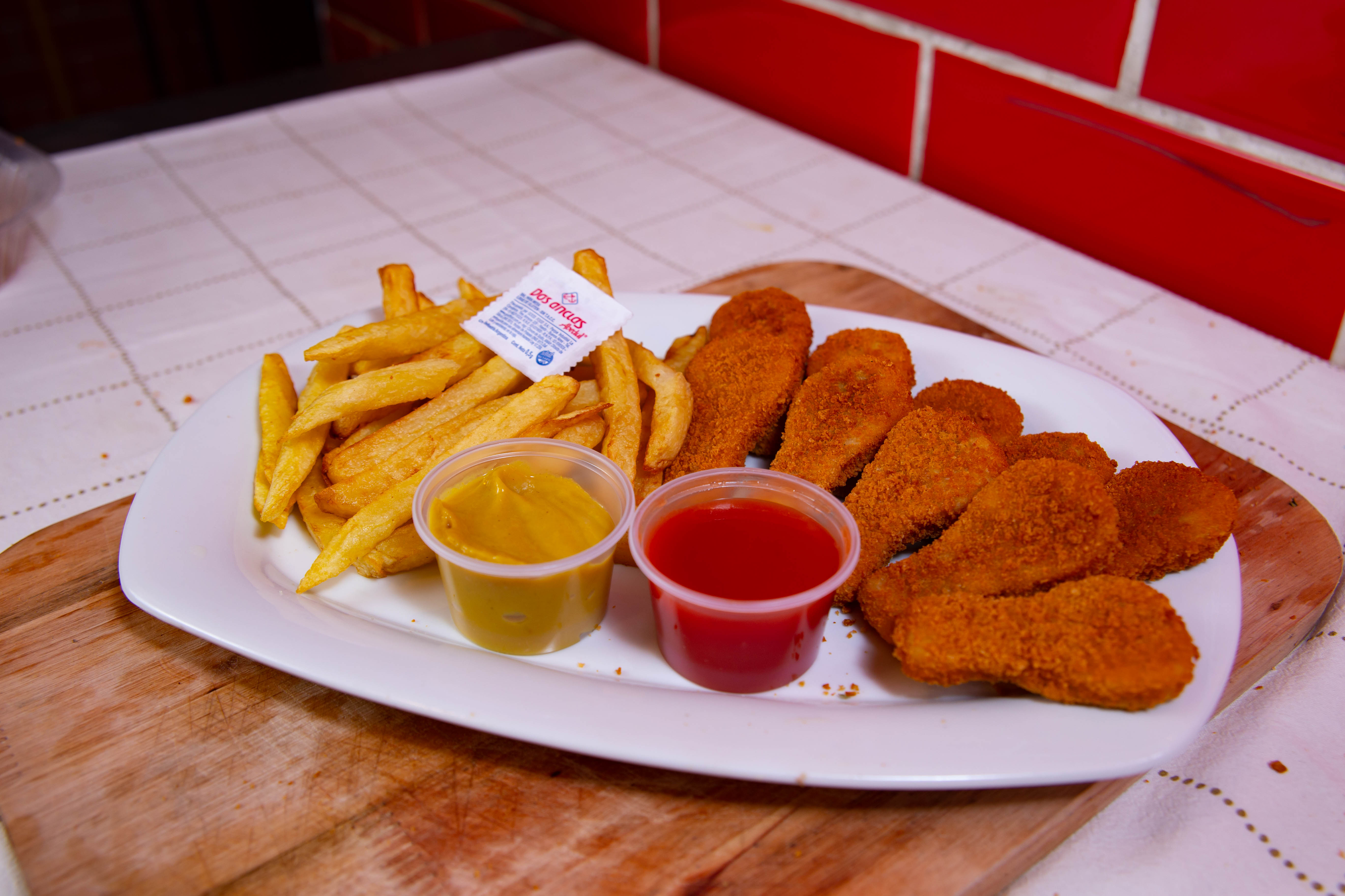 10 Bastones de pollo rebozado + papas fritas + 2 salsaS