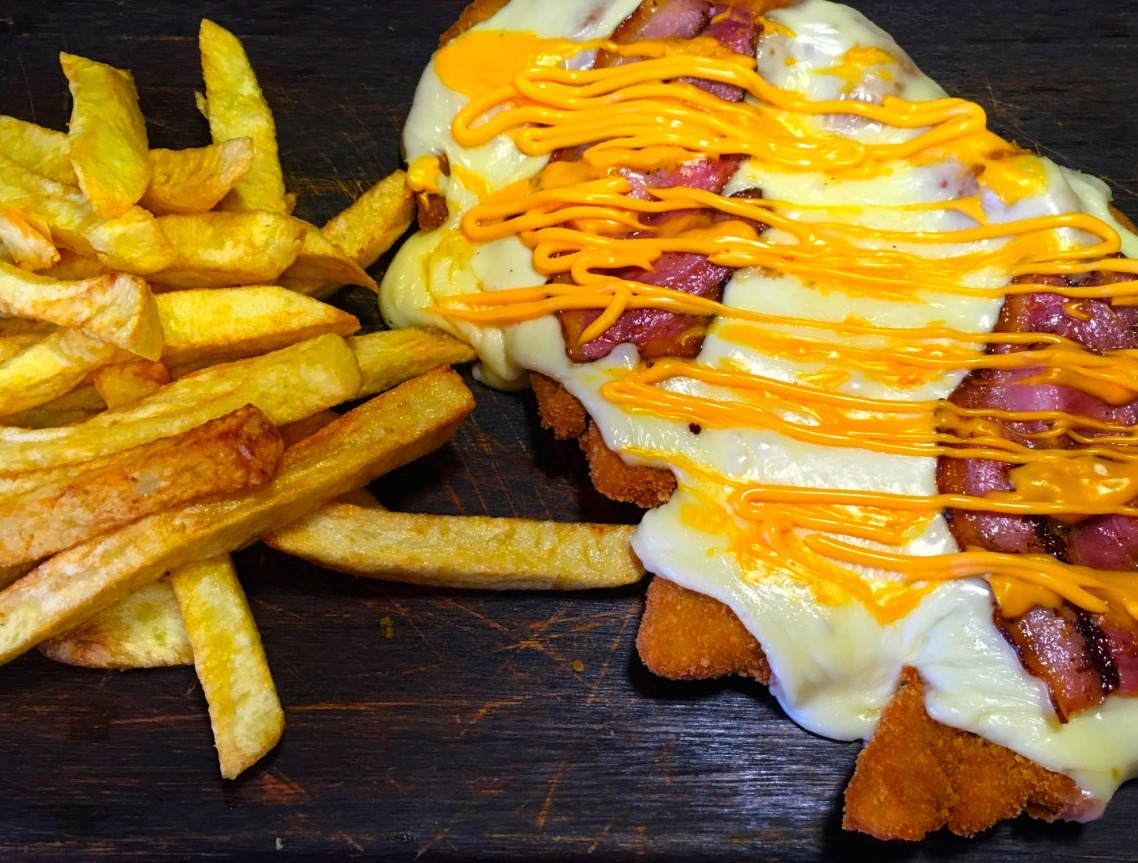 Mila de pollo, queso, panceta ahumada, y salsa cheddar