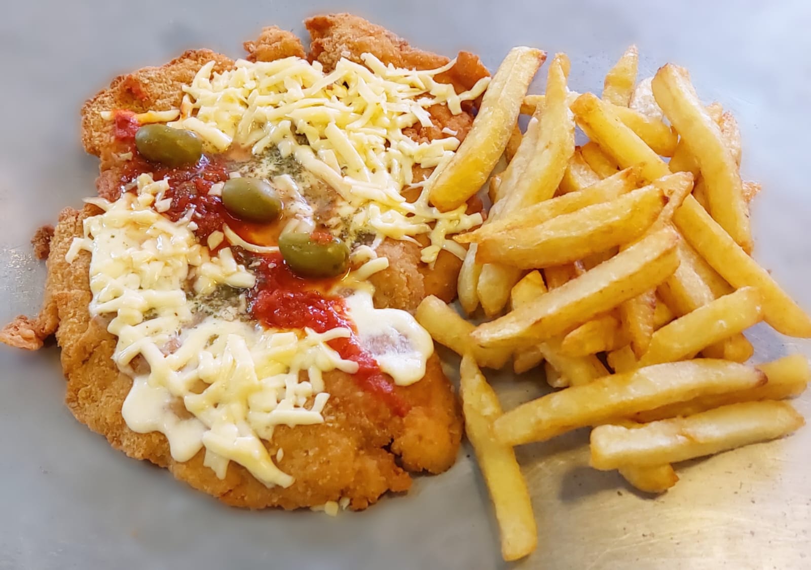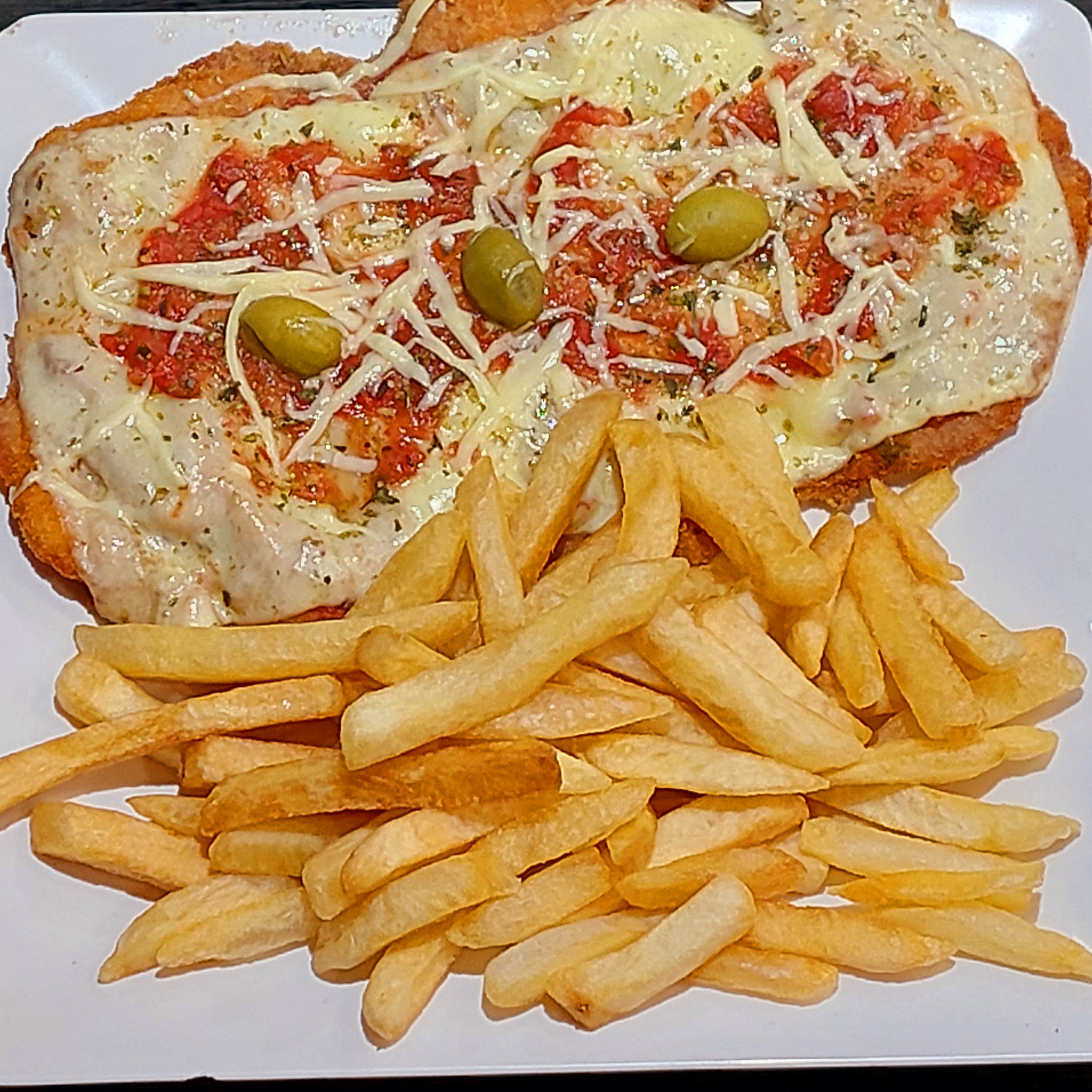 Milanesa de pollo, salsa de pizza, queso muzzarella y aceitunas