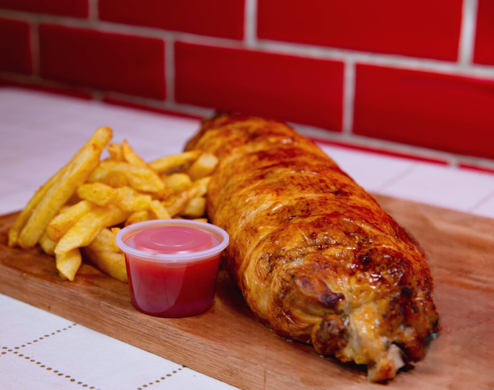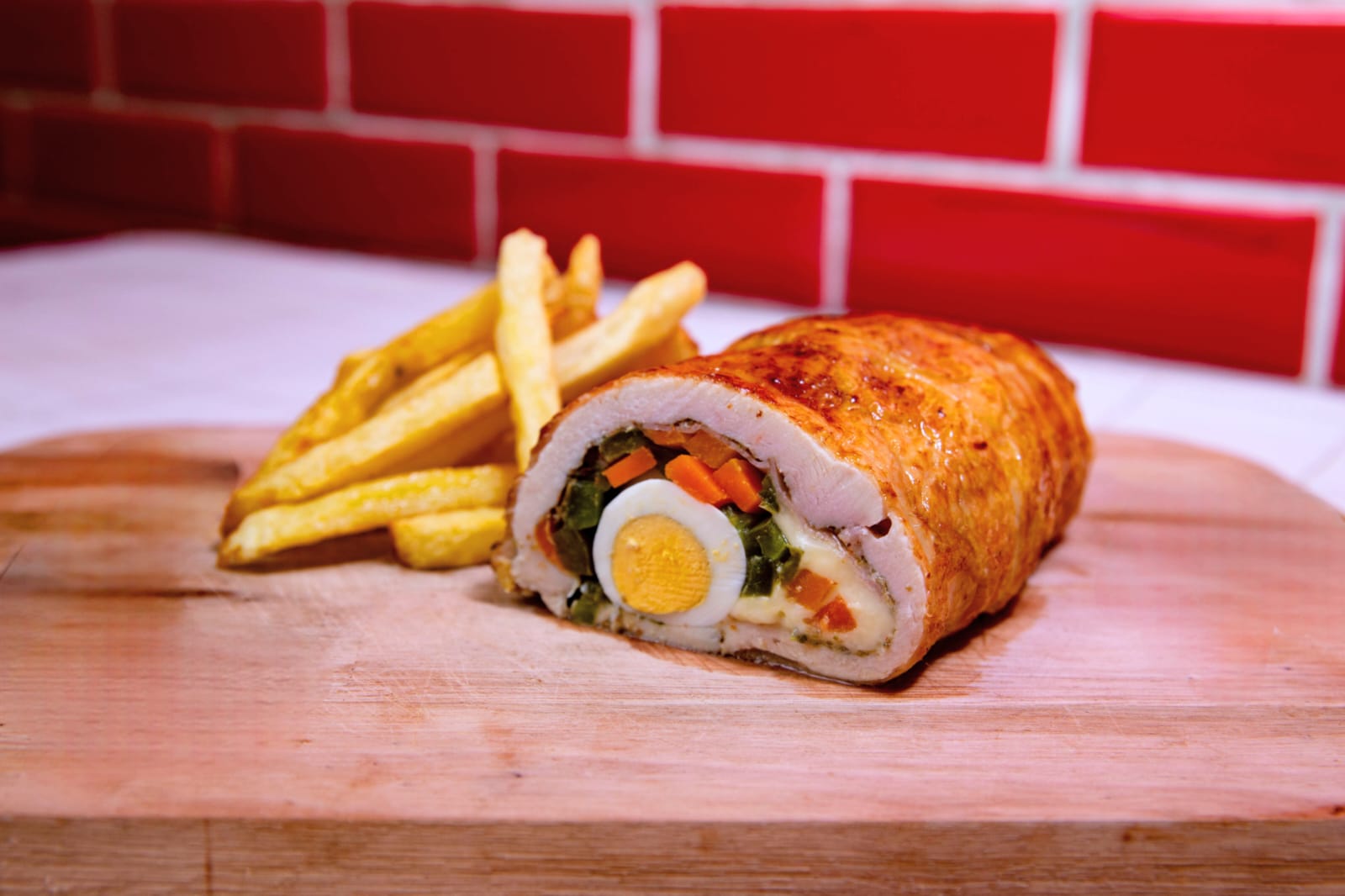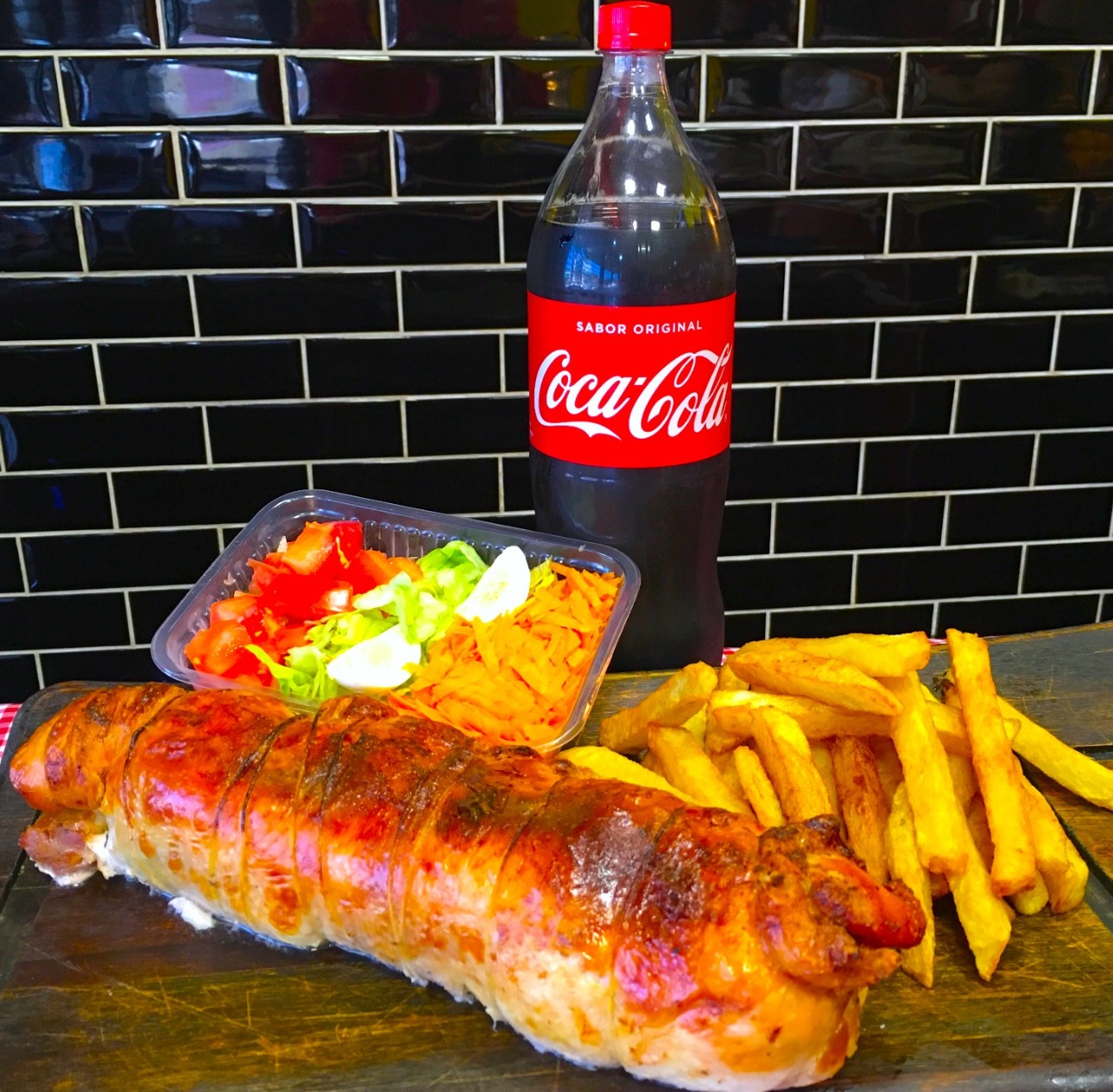 1 Arrollado de pollo entero (relleno de jamón, queso, zanahoria y huevos) + papas fritas+ ensalada + 1 gaseosa linea Coca Cola de 1.5 lts