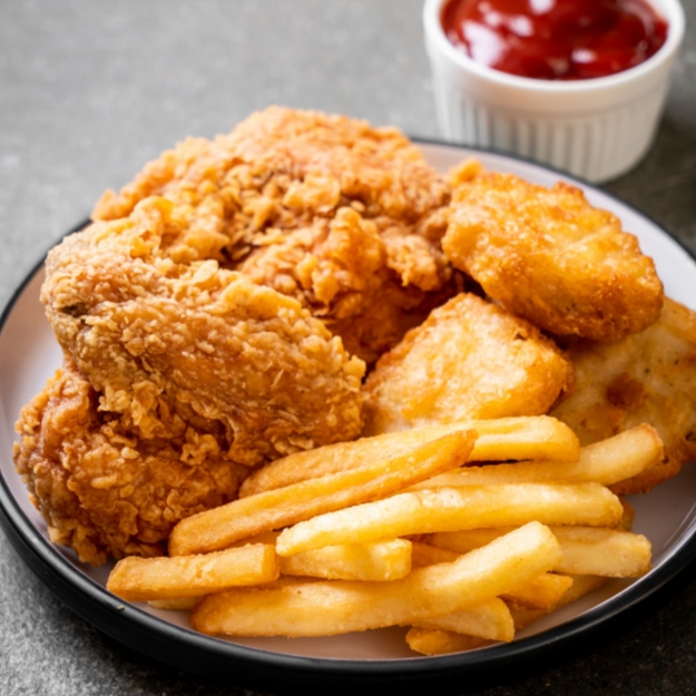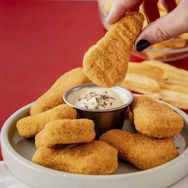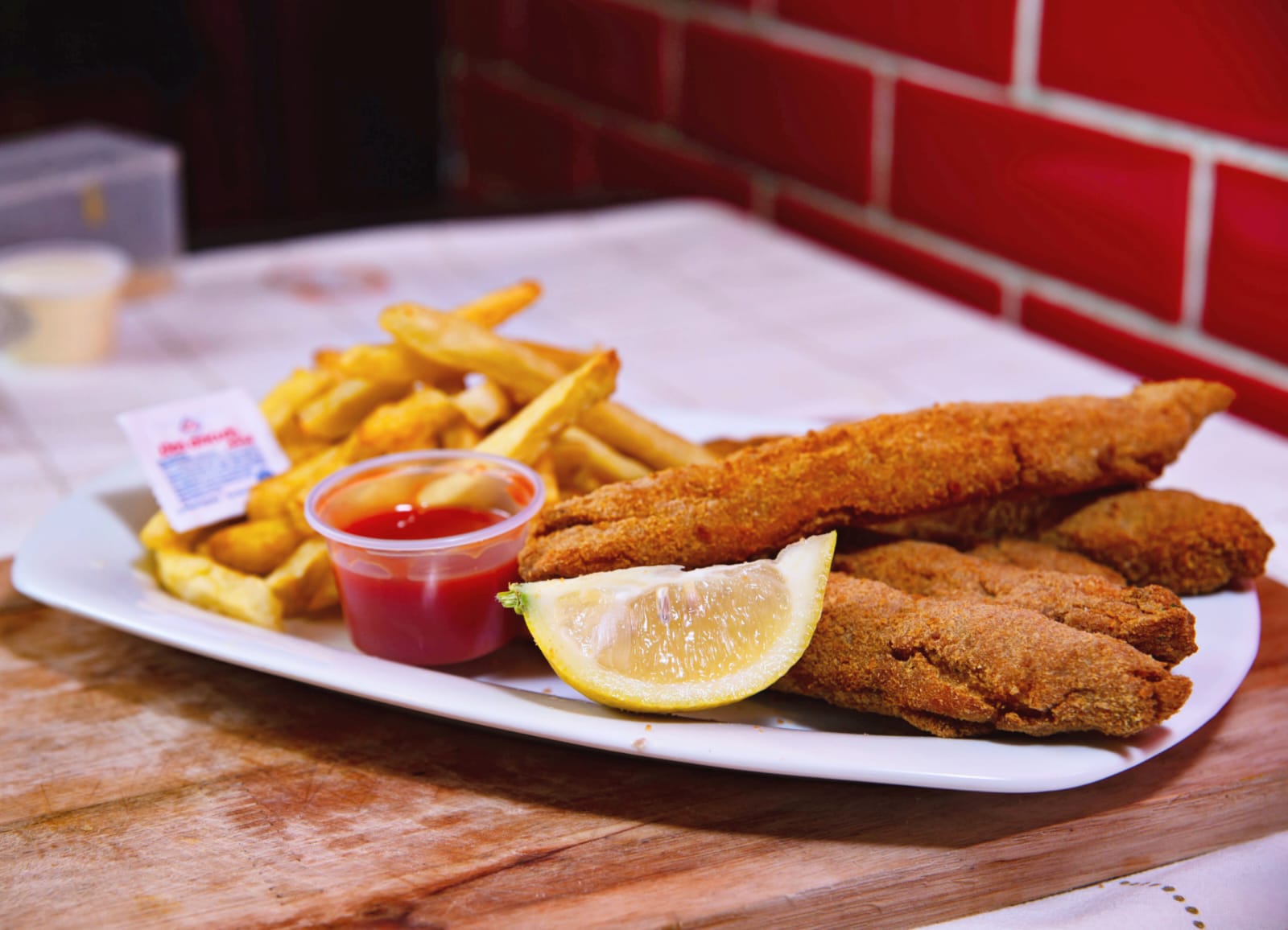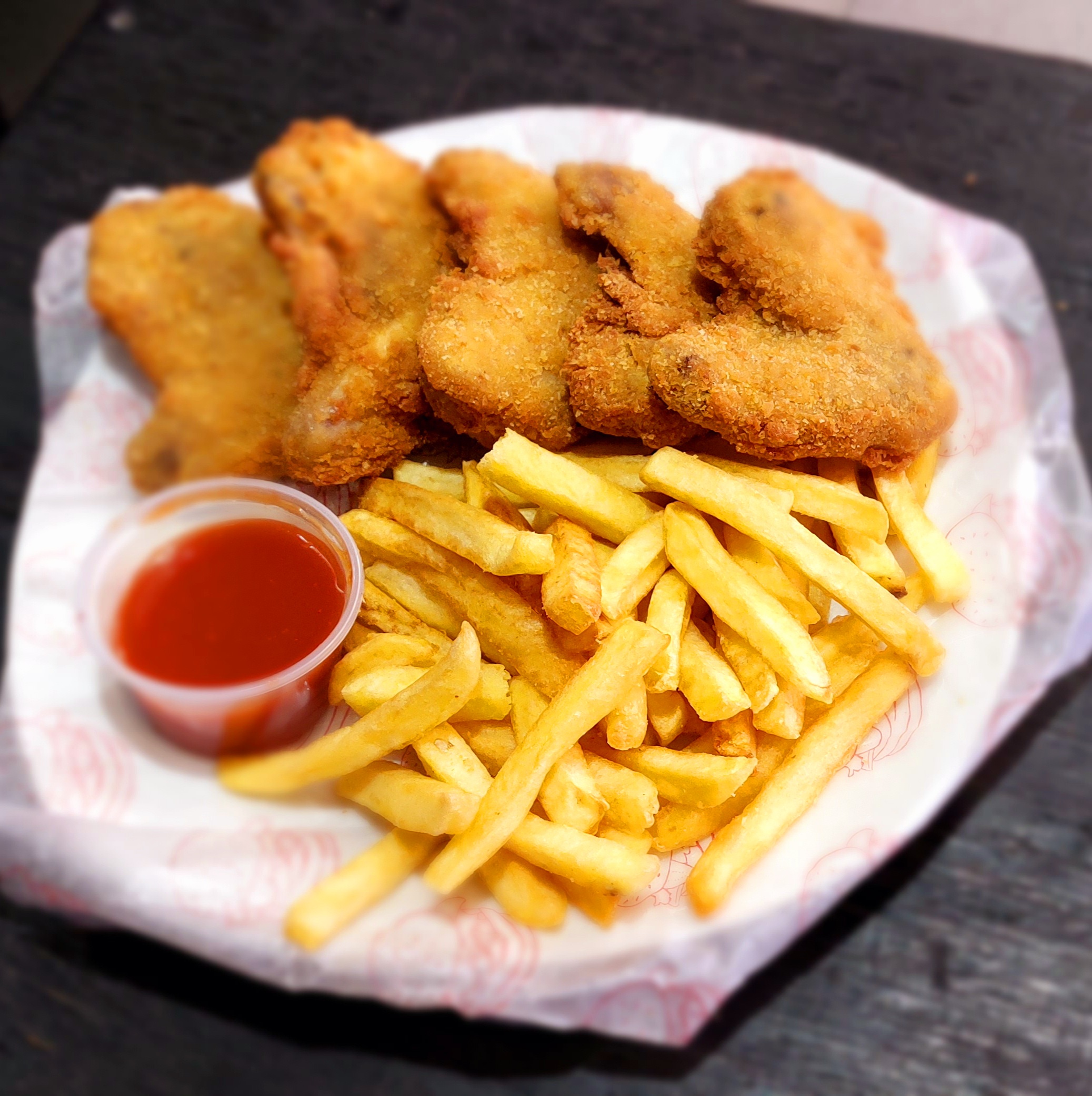 5 Bastones de pollo rebozado + papas fritas + 1 salsa