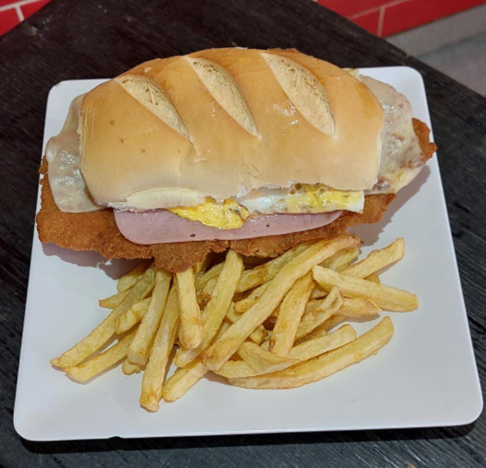 Pan francés XL, milanesa de pollo, jamón y queso, huevo frito y tomate, mayonesa