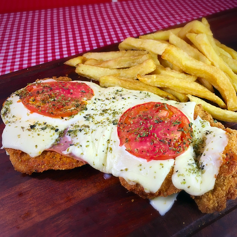 Mila de pollo, salsa de tomate, jamón, queso, tomate y orégano